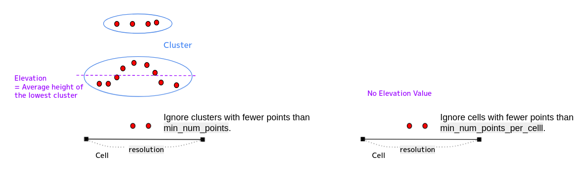 The elevation value of each cell is the average value of z of the points of the lowest cluster.